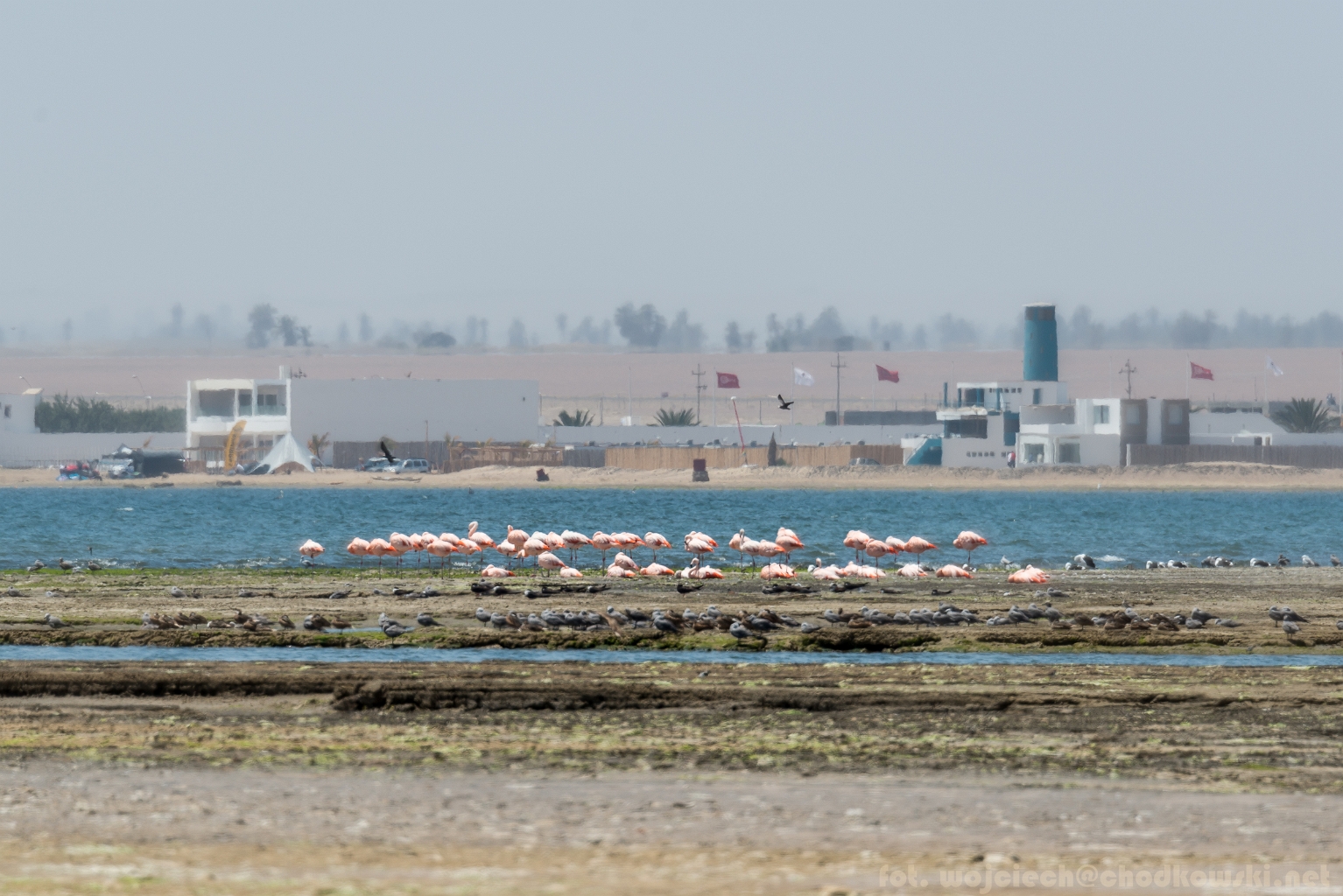 17 Flamingi chilijskie widziane w oddali ze ścieżki Sendero al Mirador. Paracs, Peru. |