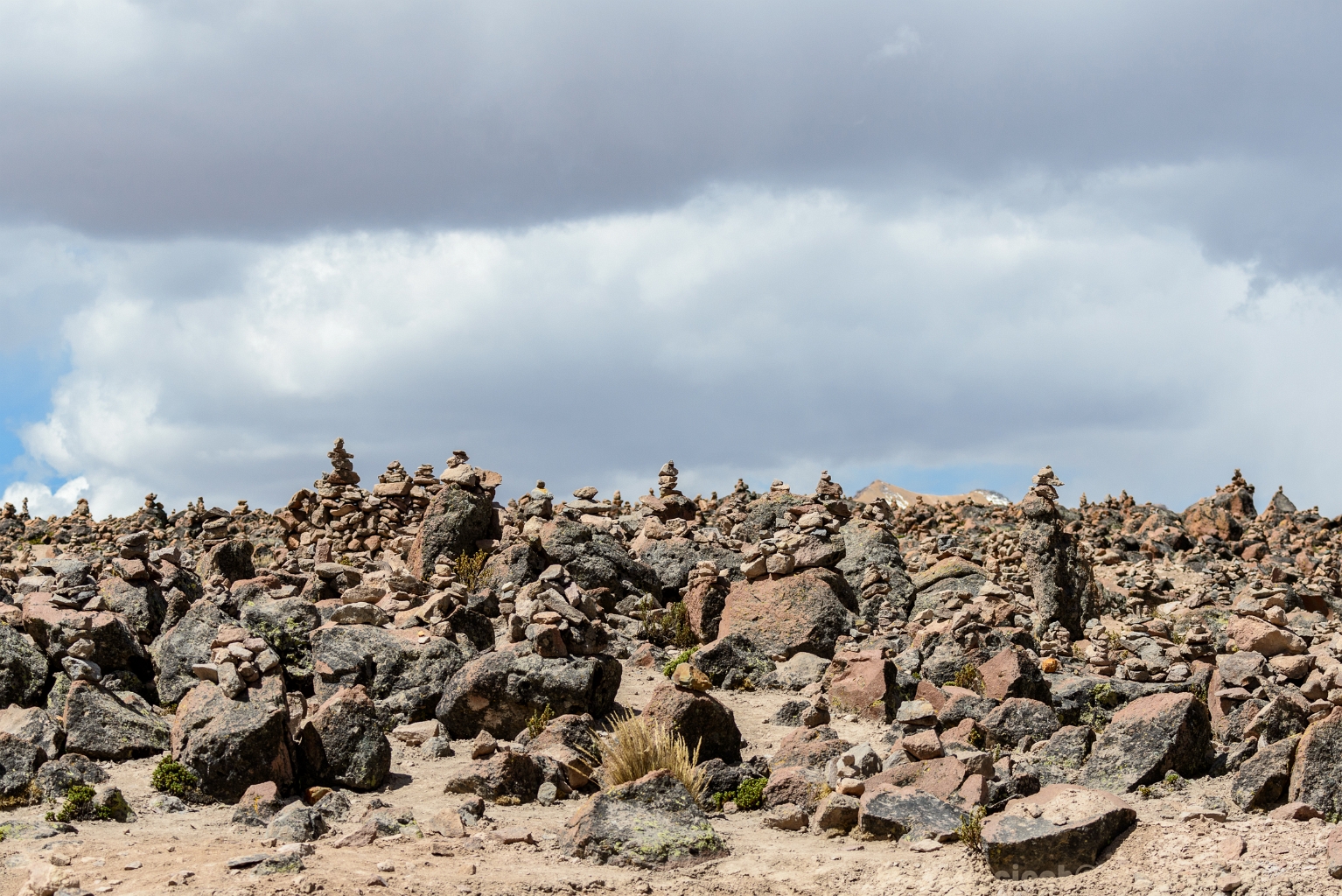 7 Przełęcz (4880 m n.p.m.) pod Warank'anthi. Piramidy z kamieni ułożone przez turystów. W drodze do Chivay. Peru. |