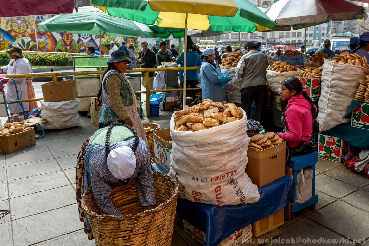 Poranne stragany ze świeżymi bułeczkami. La Paz. Boliwia