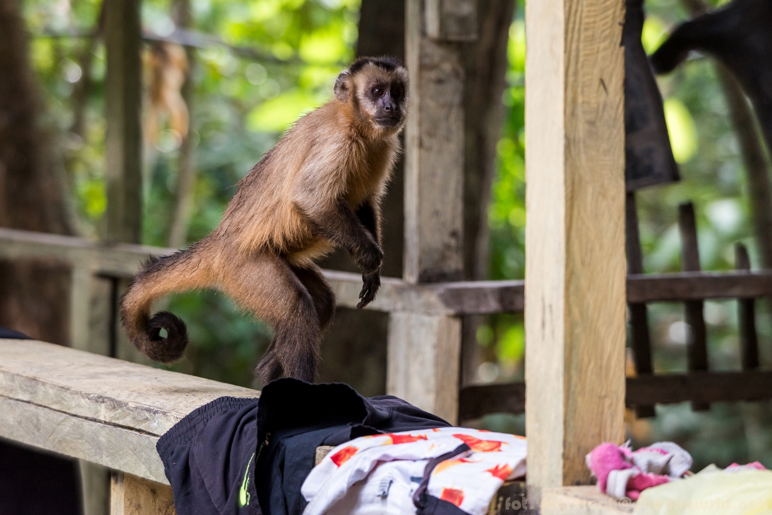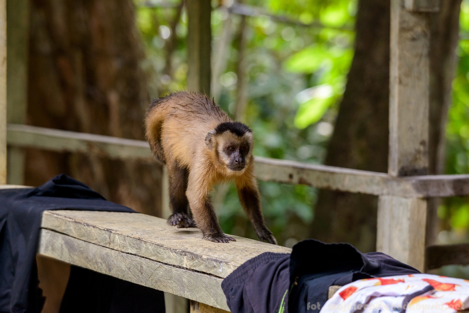 5 Kapucynka czubata (Cebus apella) buszuje w obozowisku. Rio Yucama. Boliwia. |