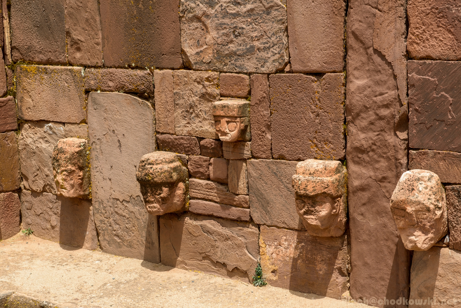 Ściana ozdobina rzębami twarzy w kaplicy(?) Templete Semisubterraneo. Tiwanaku. Boliwia.
