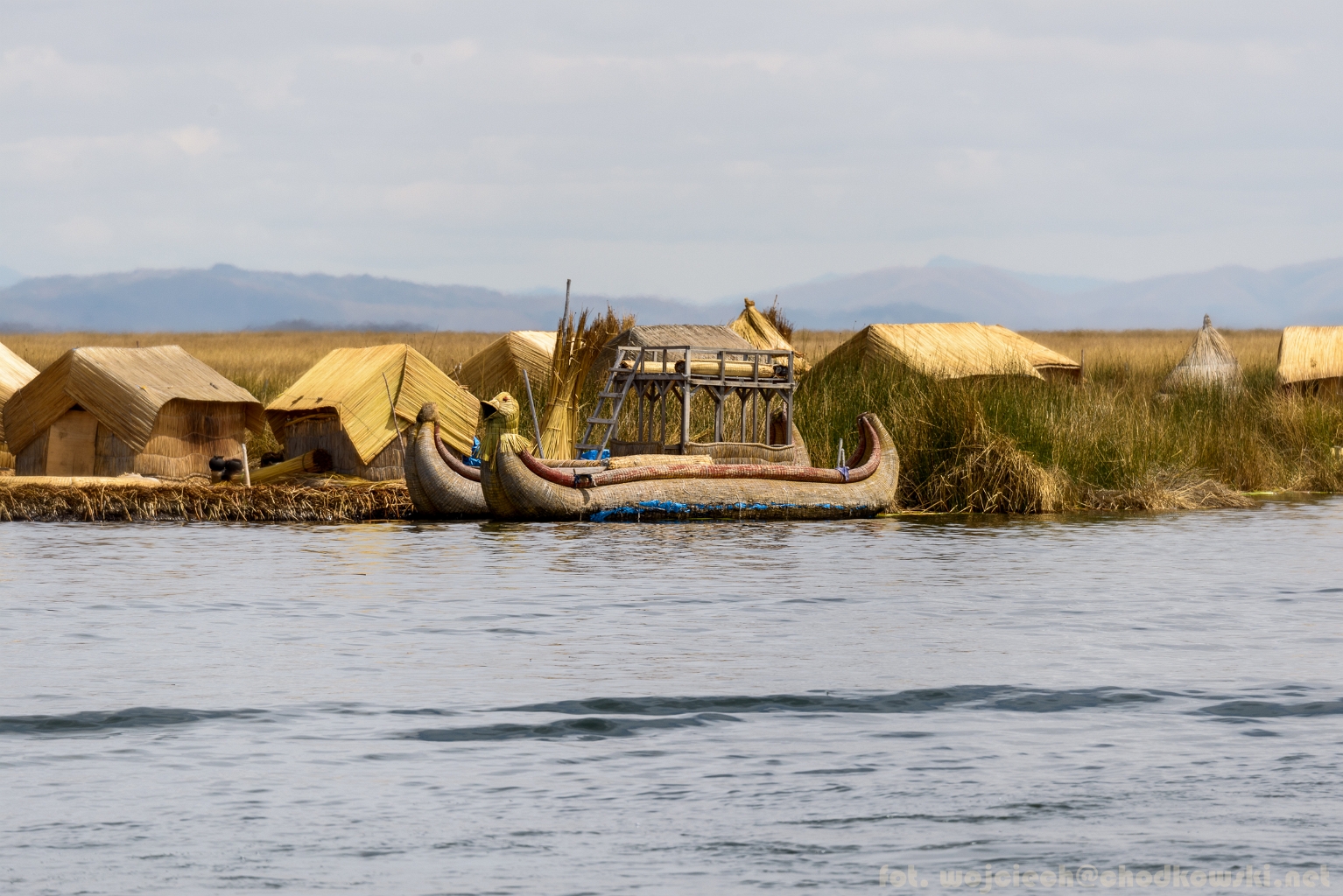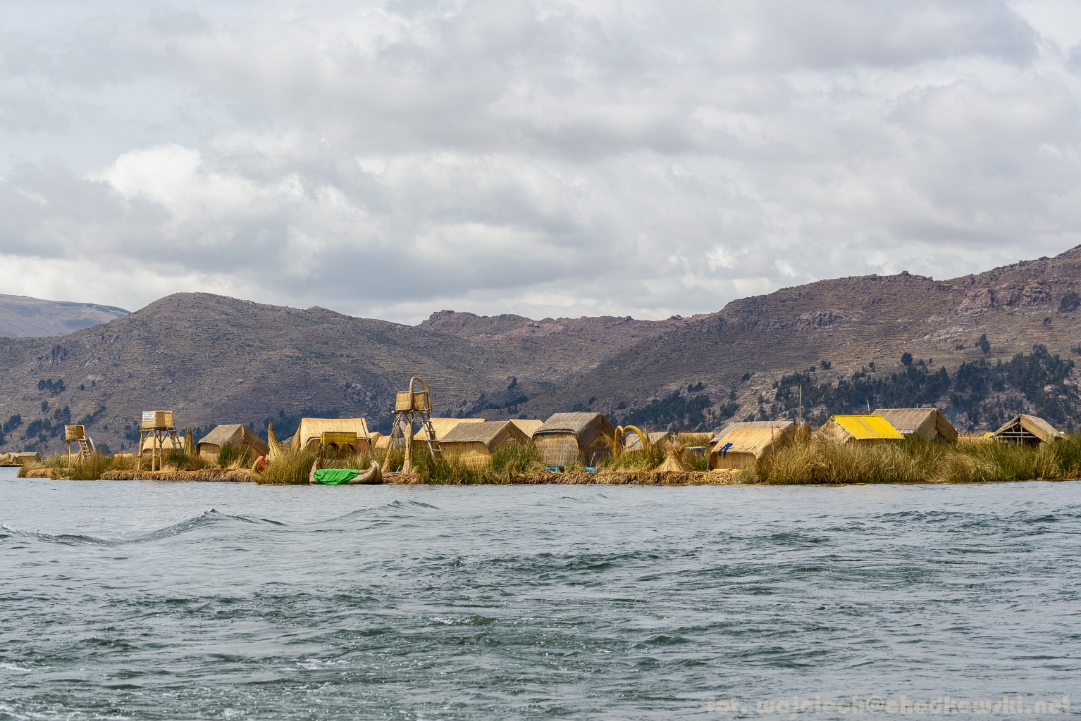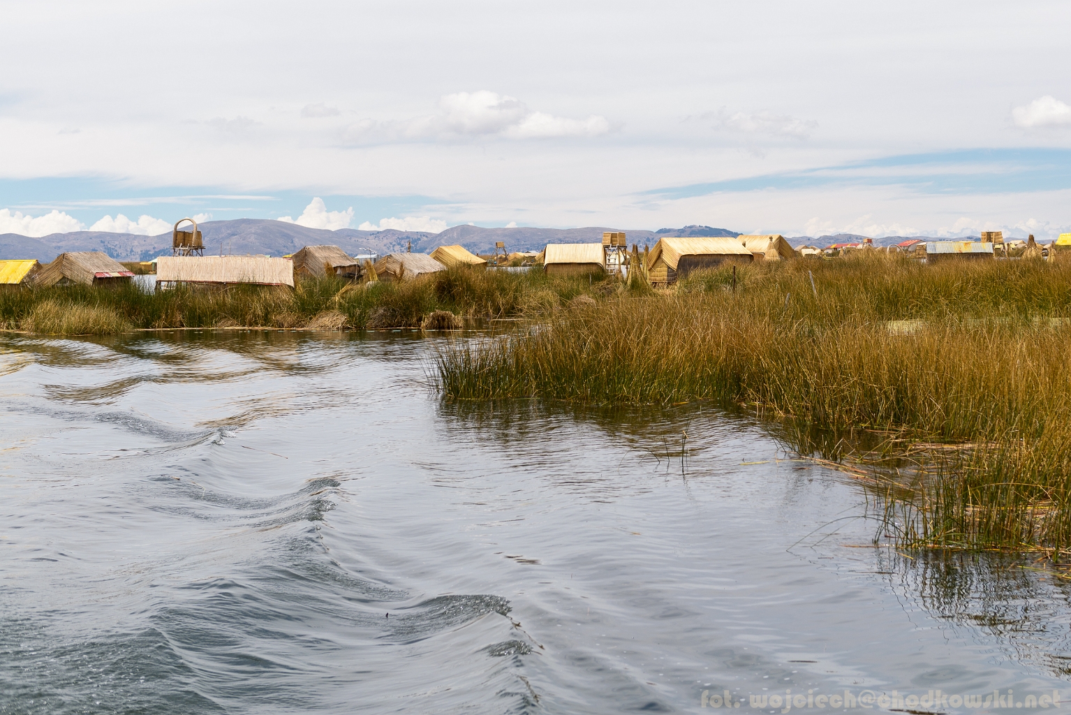 6 Pływające wyspy Uros na jeziorze Titicaca są zbudowane z trzciny. Kiedyś tubylcy tak żyli i mieszkali. Obecnie to tylko atrakcja turystyczna. Peru. |